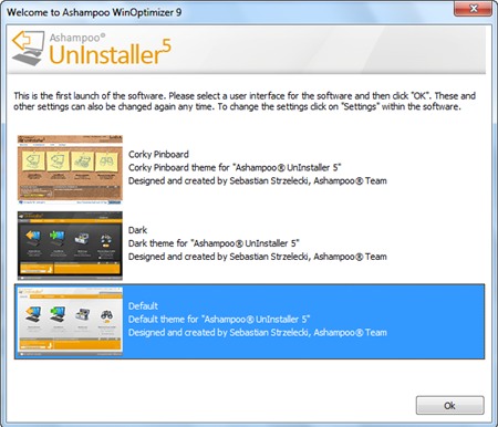 Khi cài, bạn chọn chế độ Custom Installation, bỏ dấu kiểm trước các dòng Install MyAshampoo Toolbar, Set the MyAshampoo web search as my homepage, Set the MyAshampoo web search as my default search để khỏi cài thành phần toolbar không cần thiết. Giao diện Ashampoo UnInstaller 5 được làm mới lại trông gọn gàng và chuyên nghiệp hơn bản tiền nhiệm. Khi khởi chạy lần đầu, bạn chọn một trong ba kiểu giao diện Corky Pinboard, Dark, Default rồi nhấn OK.