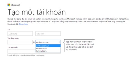 Sau đó, bạn tiến hành đăng ký tạo tài khoản Outlook.com. Trong đó, phần Tên đăng nhập bạn sẽ thấy tùy chọn tên miền outlook.com.vn bên cạnh outlook.com và hotmail.com. Ở đây, chúng ta sẽ chọn outlook.com.vn. Khi hoàn tất bước điền thông tin, nhấn nút Tạo tài khoản là bạn sở hữu ngay hộp thư có dạng <tên tài khoản@outlook.com.vn>.