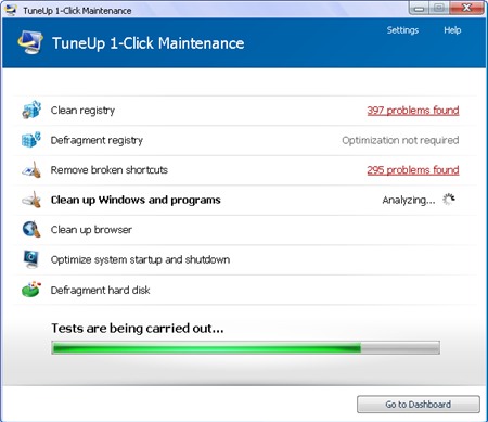Ở lần chạy đầu tiên, chức năng TuneUp 1-Click Maintenance sẽ được gọi thực thi để dọn dẹp, sửa lỗi hệ thống và nâng cao hiệu suất hoạt động cho các ứng dụng, game, bạn nhấn Start analysic now. Cũng tại hộp thoại nầy, bạn có thể vào Settings để tùy chọn các thành phần tối ưu. Hoàn tất, bạn nhấn Run maintenance để sửa chữa những lỗi phát hiện được rồi nhấn Go to Dashboard chuyển đến giao diện chính.