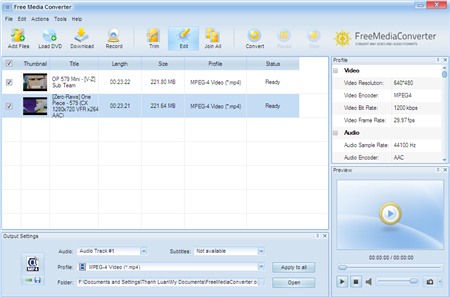 Chuyển xuống khung Output Settings phía dưới, bạn nhấn chuột vào hộp Profile chọn định dạng file sẽ chuyển đổi sang. Free Media Converter cung cấp khá nhiều profile mẫu để bạn chuyển đổi file media cho phù hợp với thiết bị xem hay nhu cầu. Nếu muốn áp dụng profile cho tất cả các file media trong danh sách, bạn nhấn Apply to all. Tất nhiên, bạn hoàn toàn có thể tùy chỉnh các thông số ở khung Profile để cho ra định dạng file, chất lượng phù hợp nhất. Tuy nhiên, nếu không rành về các thông số kỹ thuật của file media, tốt nhất bạn nên chuyển đổi thông qua các profile.
