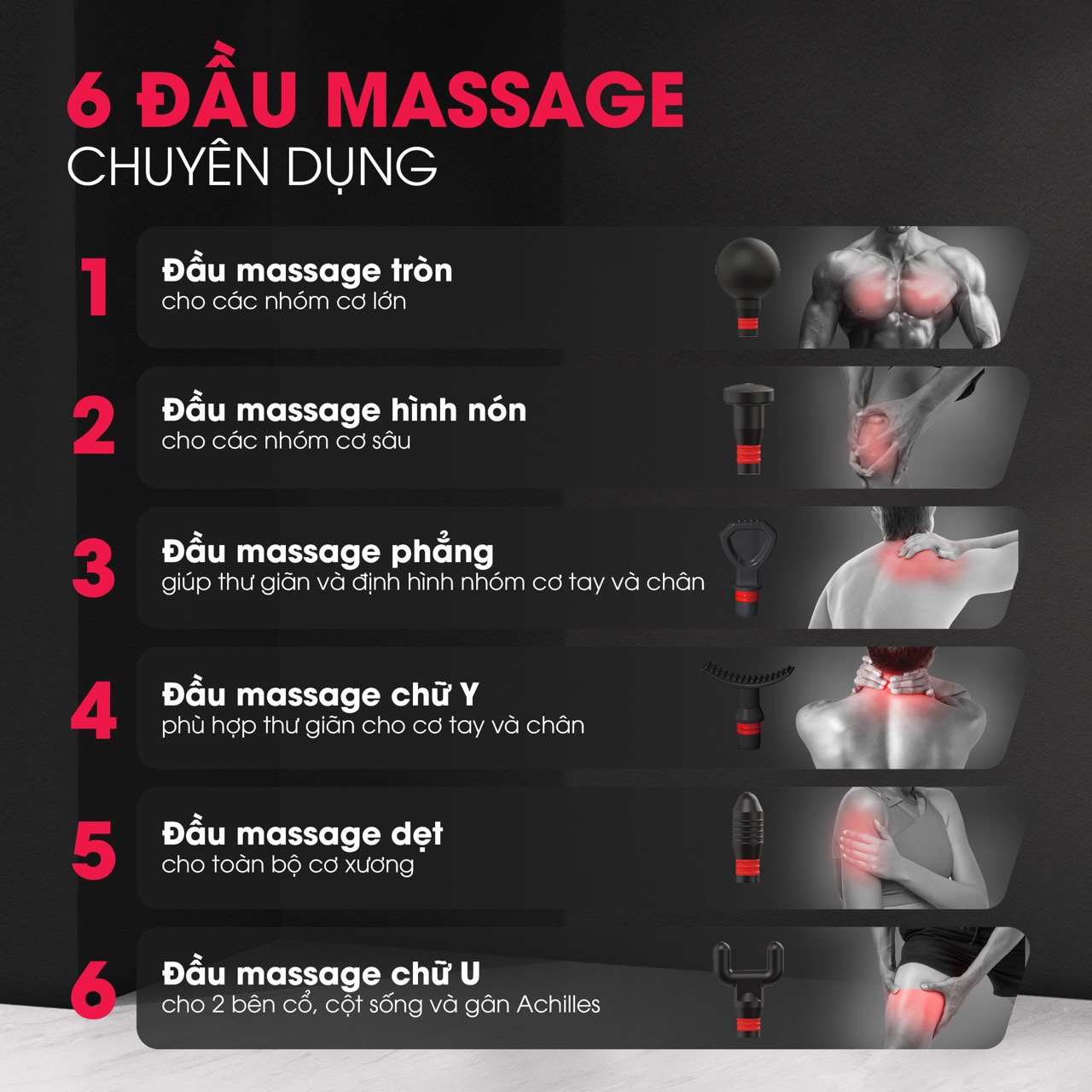 Trong sách HDSD có ghi rõ chức năng và công dụng của các đầu Massage