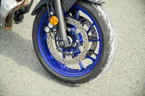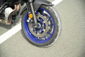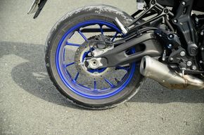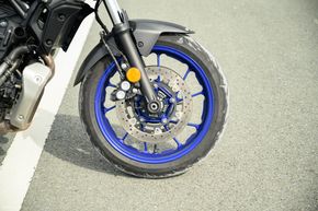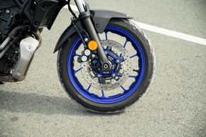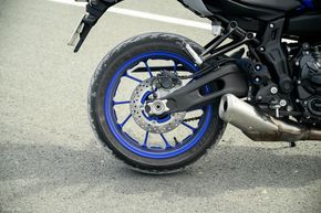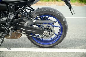 MT-07 được trang bị bộ lốp tập trung vào nhu cầu đi đô thị, thế nên nếu mang xuống đường sỏi đá một chút thì mình ngay lập tức có thể nhận thấy là độ bám của nó không thật sự tốt. Ngoài ra, ở điều kiện đi trong phố cũng như đường nhựa thông thường, lốp xe cho độ bám tốt. Mâm của xe cả trước lẫn sau đều có kích thước 17 inch.