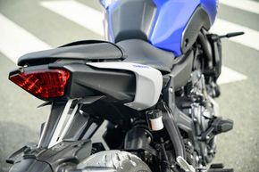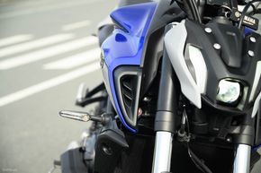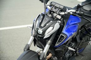 Các hốc hút gió ở 2 ốp nhựa gần đầu xe giúp tăng tính khí động học và tạo nét cơ bắp cho xe. Đèn xinhan của xe được đặt nắm tách rời 2 bên. Ban đầu thì mình thấy nó hơi lạc quẻ nhưng khi ngồi lên xe nhìn thì phần xinhan cũng khá hài hòa, và đây là đèn LED, cũng là trang bị giống trên các mẫu xe naked khác của Yamaha, như MT-03 cũng có. Nhìn từ bên hông, Yamaha MT-07 2022 nổi bật với khung sườn, các chi tiết cơ khí, và bình xăng lớn với dung tích 14 lít. Đuôi xe nổi bật với đèn hậu tạo hình chữ Y, xinhan nằm tách rời 2 bên.