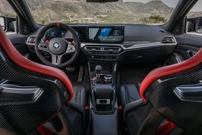 Ghế sưởi có thể điều chỉnh điện là option đối với M4 CSL nhưng lại là trang bị tiêu chuẩn trên M3 CS. Ghế được bọc da Merino và có kiểu dáng độc đáo kết hợp giữa màu đen với các điểm nhấn màu đỏ Mugello và đường chỉ khâu tương phản. Phần ốp carbon ở phía sau lưng ghế cũng tạo cho nó tính thể thao và hầm hố. Ngoài ra, nếu bạn lăn tăn 1 chiếc xe thể thao như M3 CS sẽ không phục vụ được cho gia đình thì cũng nên yên tâm bởi về cơ bản nó vẫn là 1 chiếc sedan 4 cửa với hàng ghế sau rộng rãi.