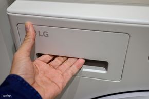 Hộp đựng nước giặt, xả có nắp đậy bên trong, thiết kế quen thuộc của máy giặt LG.
