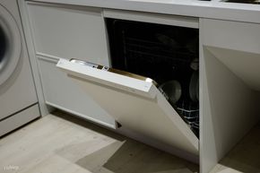 Một chiếc máy rửa chén màu trắng với thiết kế bên ngoài tối giản, cực kỳ hiện đại. Trông nó hoà hợp với kệ bếp, mình rất kích những kiểu thiết kế thế này.