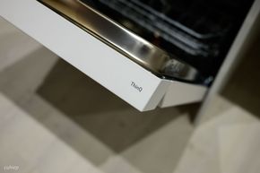 Một chiếc lò nướng nổi bật với các nút vặn lớn, được thiết kế để âm gọn gàng trong tủ bếp.