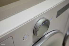 Bộ đôi máy giặt, sấy không chỉ đẹp mà còn tiết kiệm không gian, dù để cạnh nhau. Bảng điều đèn LED, núm vặn điều khiển được thiết kế cùng kiểu.