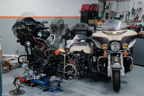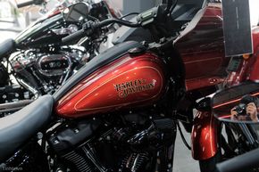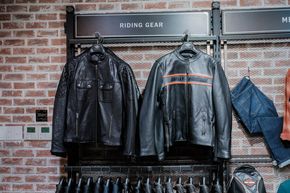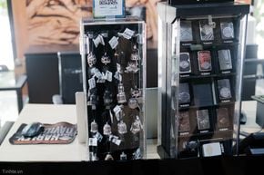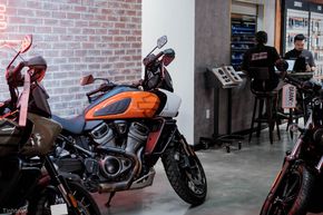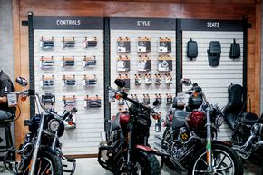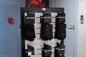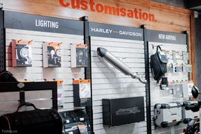 Ngoài xe ra thì ở đây còn có sẵn những kệ treo phụ kiện để anh em chơi Harley hoặc anh em mua xe có thể ngay lập tức chọn đồ để lên cho xe của mình. Có 2-3 kệ phụ kiện gì đó và mỗi kệ sẽ trưng bày theo từng nhóm khác nhau, như ống xả, lọc gió, đèn trợ sáng,..