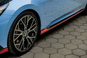 Bộ vành 19 inch hợp kim hiệu năng cao với yếu tố cứng chắc và trọng lượng nhẹ, trang bị tiêu chuẩn là bộ lốp Michelin Pilot Sport 4S kích thước 245/35/ ZR19, đi kèm với đó là bộ phanh hiệu xuất cao được tinh chỉnh từ Hyundai N Motorsport. Bộ phanh với đĩa phanh kích thước 360mm (phiên bản N-line là 305mm và 280mm của các bản tiêu chuẩn) cùng má phanh có độ ma sát cao để đảm bảo hiệu suất phanh tốt. Hệ thống phanh của xe còn được trang bị khe làm mát bổ sung, kết hợp các thanh dẫn khí phanh, giúp cải thiện hiệu quả làm mát, duy trì hiệu quả phanh trong những điều kiện vận hành khắc nghiệt. Đặc biệt, xe được duy trì phanh tay dạng cơ, giúp người lái chủ động và có thể "biểu diễn" những màn thoát cua đẹp mắt, hiệu quả hơn.Nội thất