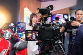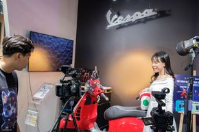 - Góc quay phim chuyên nghiệp: với chiếc xe Vespa Gts màu sắc nổi bật, không gian này giúp người dùng quan tâm về những dòng máy ảnh chuyên quay phim hay dòng máy quay Cinema Line của Sony có cơ hội tìm hiểu cách thức sử dụng máy, thiết lập thông số quay dựa trên những trang bị đèn, background, sản phẩm mẫu có sẵn.