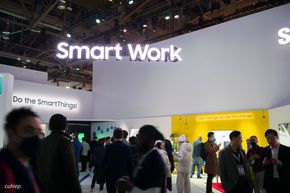 Một người tham dự triển lãm đang đọc các thương hiệu đồ điện tử nằm trong hệ sinh thái khổng lồ mà Samsung đang xây dựng.