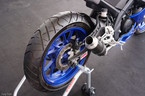 Vẫn sử dụng phanh đĩa nguyên bản, phuộc hành trình ngược KYB. Với phiên bản R15 V3 này bộ lốp đi kèm là IRC RX-01R Road Winner.