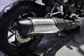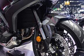 Đầu xe còn nổi bật với kính chắn gió cỡ lớn, cung cấp khả năng điều chỉnh chiều cao & góc nghiêng 5 cấp độ, khoảng cách tổng cộng 164mm giữa vị trí cao/thấp nhất. Đặc biệt là có thêm cánh gió nhỏ ở 2 bên giúp bảo vệ người lái ở vị trí quanh cánh tay và phần dưới cơ thể, thiết kế này giúp người lái núp gió và tránh thời tiết lạnh tốt hơn.