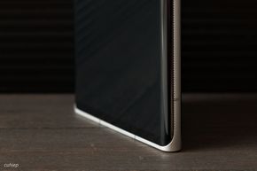 Cằm dưới màn hình cũng không đều với 3 cạnh còn lại. Nhưng các góc bo thì cong đồng đều