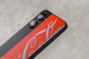 Máy có thiết kế vuông vức, mặt lưng phẳng và tông màu chủ đạo là đỏ và đen. Mặt lưng được in logo Coca-Cola tương đối lớn. Dù đã cố tình cắt đi phần bên dưới nhưng vẫn đủ để người dùng nhận thương hiệu nước giải khát quen thuộc. Ở phần màu đen còn lại là logo của realme, nằm ở góc đặc trưng.