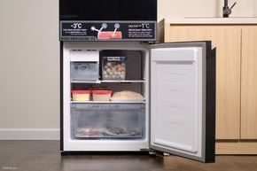 Chỉ cần cho nước vào hộp chứa, 2,5L ở trên ngăn mát → đá viên sẽ tự động được tạo ra ở khay bên dưới ngăn đông.