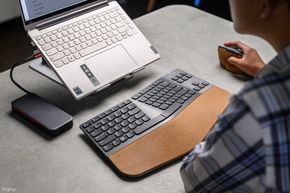 Lenovo gọi nó là Go Wireless Split keyboard, dù thực sự nó trông không giống một phụ kiện 'Go" lắm nhưng mà tính công thái học của nó cũng là một điểm thú vị. Dạng bàn phím kiểu này anh em đã thấy qua một số OEM làm rồi, nhưng với Lenovo thì anh em sẽ thấy nó còn được tuỳ chỉnh nhiều hơn về một số điểm trong thiết kế.