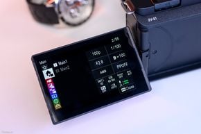 Tuy vậy, có một vài thứ khiến mình thấy thích thú khi sử dụng màn hình của con ZV-E1 này. Anh em có thể vuốt từ 2 bên qua để tuỳ chỉnh các chức năng hoặc vuột ngược trở lại để có cái màn hình "sạch sẽ". Bên cạnh đó, anh em nhấn vào biểu tượng khẩu độ, cân bằng trắng và vuốt để thay đổi các thông số này.