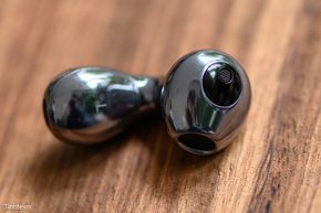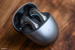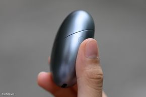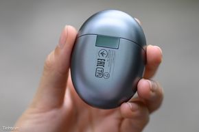 Hộp sạc của Huawei FreeBuds 5 có thiết kế hình bầu dục, tương tự quả trứng nhưng dẹp. Bề mặt nhám nhẹ và màu bạc sáng sủa, hạn chế bám vân tay. Phía trước có đèn LED để thông báo tình trạng kết nối và pin.