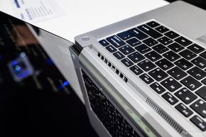 Nút nguồn rời hình bát giác khá lạ mắt, 2 bên bàn phím là khu vực loa tích hợp, tương tự như MacBook.