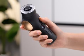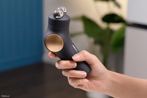 TheraFace Pro có một tay cầm bọc cao su mềm mại được thiết kế vừa vặn và thuận lợi cho việc cầm nắm cũng như thao tác, không quá nặng. Trên tay cầm có các nút bấm điều khiển cấp độ rung, màu đèn,… và màn hình nhỏ để theo dõi tính năng.