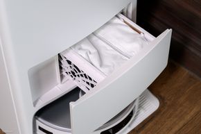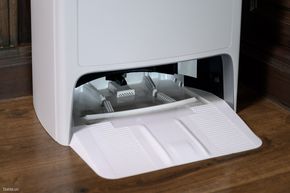 Ngay phía trước của thân máy sẽ là nơi bố trí của túi đựng rác. Robot cứ mỗi lần hút bụi xong thì rác nó sẽ mang về đổ vào đây thay vì trữ trong khoang rác nhỏ trên thân. Tấm lọc bên trong ngăn đựng rác cũng được trang bị thêm 1 lớp lọc bằng than hoạt tính theo tiêu chuẩn E11 và túi lọc cũng được trang bị thêm một lớp than hoạt tính như vậy, điều này giúp robot có khả năng khử khuẩn và bụi mịn 99% theo kết quả test và chúng nhận của một bên thứ 3. Việc trang bị thêm 1 lớp than hoạt tính cho túi lọc còn giúp khắc phục và cải thiện được mùi hôi trong quá trình lưu trữ rác, vốn lên tới 75 ngày nhờ vào dung tích lớn.