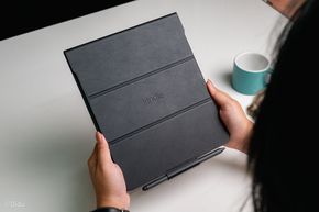 Cảm giác viết lên màn hình E Ink nhám rất đã, gần giống như khi chúng ta thao tác trên giấy thật, nó có chút nhám để tăng độ bám và ma sát chứ không trơn tuột như iPad. Bút Premium cũng xịn, đầu tẩy nhấn xuống và di trên màn hình là nó sẽ xóa, chả khác nào một cái bút chì vậy. Còn với bao da bảo vệ, nó được gắn với Scribe qua hit nam châm, ngoài làm vỏ bảo vệ và đựng bút thì chúng ta còn có thể nâng máy hoặc dựng đứng máy khi đọc, khi viết. Bao da này có lớp nỉ mềm bên trong và da mịn bên ngoài, cảm giác rất là cao cấp.