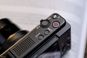 Mặt trên ta có nút nguồn, phím S&Q, nút quay phim riêng màu đỏ, Custom 1 và zoom ống kính. Ngoài ra còn chưa mic thu và cổng multi interface