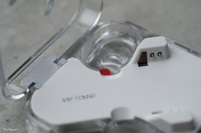 Mỗi bên tai nghe, tương ứng với mỗi hốc sẽ có chấm màu để phân biệt tai trái và phải. Chấm màu đỏ là bên phải, và chấm trằng là bên trái để có thể nhận biết khi cho vào case. Khi dùng xong, người dùng sẽ cho lại vào hộp, một nam châm sẽ hỗ trợ hít vào rãnh chứa để cố định lại. Lúc đó 2 bên earbud sẽ được sạc thông qua 2 chân tiếp xúc ở mỗi bên rãnh.