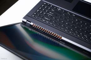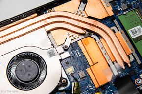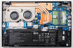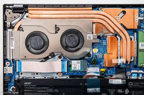 Nâng cấp cấu hình và hiệu năng thì cần giải quyết được bài toán nhiệt độ. Có thể nói trong phân khúc dưới 20 triệu đồng, Aspire 7 2023 là 1 trong số ít những mẫu laptop sở hữu hệ thống tản nhiệt ấn tượng. Acer trang bị cho sản phẩm khả năng làm mát tốt nhờ khối lá đồng kết hợp cùng 3 heatpipe dẫn nhiệt từ CPU và GPU, cuối cùng đẩy ra môi trường nhờ 2 quạt. Khoảng 1/2 diện tích mặt D là các khe lấy gió, trong khi khe thoát nhiệt có ở vị trí cạnh dưới màn hình và bên tay phải. Hơi tiếc là trong quá trình sử dụng thì có thể tay phải (tay cầm chuột ngoài) sẽ có chút khó chịu do gió nóng thổi ra. Bù lại Acer tập trung các thành phần tỏa nhiệt ở nửa trên của thân máy, do đó phần lót tay sẽ rất ít bị ảnh hưởng, mang lại sự thoải mái trong quá trình sử dụng.