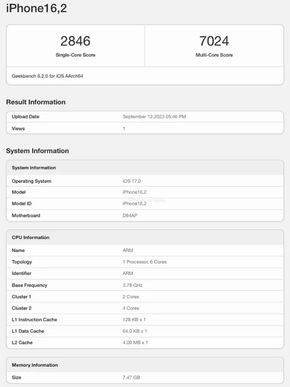 Theo chia sẻ của Apple, A17 Pro cho hiệu năng CPU tốt hơn 10% so với A16 Bionic và GPU là 20%. Thông số cụ thể của A17 Pro bao gồm codename và kiến trúc Arm vẫn chưa được tiết lộ, nhưng điểm số benchmark cho thấy hiệu năng CPU của A17 Pro trên iPhone 15 Pro cao hơn kha khá so với A16 Bionic trên iPhone 14 Pro.