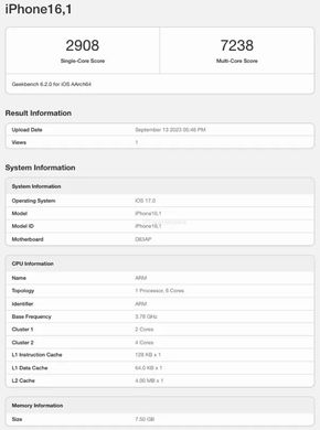 Điểm đơn nhân và đa nhân của A17 Pro chấm trên Geekbench 6 là 2908 và 7238 điểm, so với A16 Bionic là 2519 và 6367, so với A15 Bionic là 2183 và 5144.