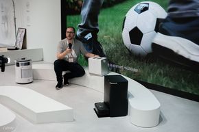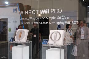 Ở khu vực giới thiệu robot lau kính, hãng thiết kế 1 tấm kính đứng để robot di chuyển. Winbot W2 Pro là phiên bản nâng cấp của W1 Pro, nó có trạm sạc riêng, được thiết kế dưới dạng hộp có tay nắm, rất gọn và tiện cho việc mang đi, cũng như cấp điện cho robot, mà không phụ thuộc vào nguồn điện cố định.