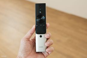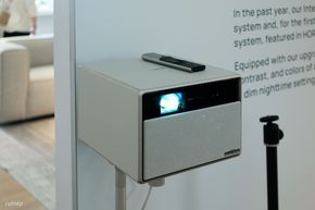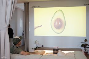 Tại triển lãm XGIMI cũng trình diễn về khả năng này, họ đặt một máy chiếu Horizon Ultra lên một cái gimbal và một cái khung hình trên tường. Mỗi lần di chuyển gimbal thì máy sẽ tự động căn lại khung hình.