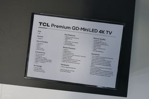 Khu vực trưng bày của TCL ở IFA 2023 có mẫu TV kích thước lớn rất ấn tượng - Premium QD-Mini LED 4K, đặc biệt sở hữu độ sáng tối đa (peak) lên tới 5000 nits. Đây là con số về độ sáng gần như cao nhất hiện nay trên thị trường TV, mang lại độ tương phản động cũng cực kỳ cao 5,000,000:1, cung cấp khả năng hiển thị hình ảnh đẹp, có chiều sâu, tương phản tốt nhất là các nội dung HDR.