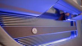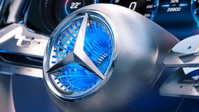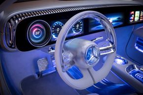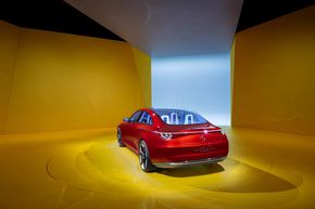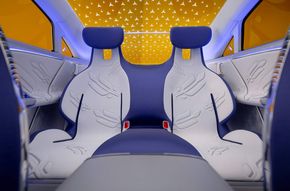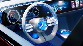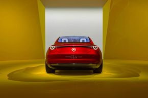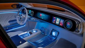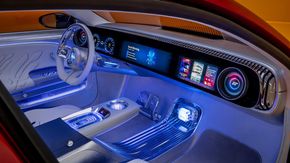 Giống như các mẫu xe điện khác của Mercedes, nội thất cũng xe cũng sẽ sử dụng tông màu trắng làm chủ đạo. Trần xe trong suốt với hàng loạt các logo ngôi sao 3 cánh quen thuộc. Xe được trang bị một cụm chứa các cảm biến mà Mercedes cho biết sẽ mang tới cho xe khả năng tự lái cấp 3. Nhiều khả năng công nghệ này sẽ không có mặt ngay lập tức khi xe được bán, nhưng có thể được cập nhật OTA khi tới thời điểm phù hợp.