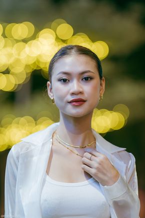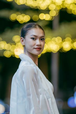 May mắn sao ở trung tâm thương mại, họ đã trang trí đèn trên cây thông giáng sinh rồi, nên khoảng cách phía sau chỉ 2-3m thôi, thậm chí còn gần hơn dường như gấp đôi khoảng cách từ mình đến mẫu nữa, mà anh em thấy bokeh lên ngập ngụa luôn