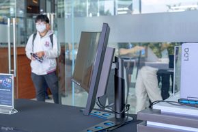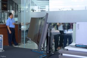 Ngoài khu vực check-in hiện đang trưng bày mẫu màn hình cong Legion Y44-W10, đây là mẫu màn hình gaming cong 44", tỉ lệ 32:10, độ phân giải 3840 x 1200, đạt 90% DCI-P3, 99% sRGB, tốc độ làm tươi 144Hz.