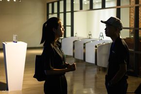 Sân khấu mình đứng sẽ được đánh đèn nhẹ tuy nhiên anh sáng sẽ khá tối và rất nhiều màn led. Tuy mình thấy ban tổ chức chủ yếu dùng các màu xanh lơ nhẹ nhưng dù gì nó cũng là màn hình LED nên khó tránh được sự rực rỡ và mình sẽ chỉ còn là một bóng đen. Thêm nữa là tất cả mọi người trong hội trường đều mặc áo đen, mình cũng mặc một chiếc áo đen. Cho nên chọn giày trắng sẽ tương phản quá lớn và cam sẽ là màu vẫn nổi bật và vẫn thấy được.