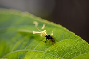 1 con bọ ngựa đã nhai gần xong phần đầu của con ruồi, mình mở tốc hết cỡ và chụp khoảng 50 tấm thì có khoảng 10 tấm không nhoè. Nguyên nhân là quá gió, mình không muốn chạm vào lá giữ lại, tại sợ con bọ chạy đi mất (hình đã crop 100%)