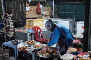 Khu ăn uống sẽ ở trong nhà có mái che đỡ lạnh hơn rất nhiều, chủ yếu là bán các món phở, bún nước. Mình ăn phần thịt nào thì họ sẽ cắt cho mình. Mặc dù mới sáng sớm thôi, nhưng nhiều chú đã bắt đầu ăn uống rượu, tụ họp với bạn bè rồi.