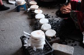 Một quầy hàng bán bánh trong chợ phiên, thường những chỗ này sẽ bán bánh tam giác mạch, bánh khoai mì, mỗi miếng sẽ có giá là 10.000 đồng. Các bạn có thể ăn thử bánh tam giác mạch, vị nó hơi đặc trưng và nhẫn nếu ai không quen ban đầu sẽ thấy khá là khó ăn.