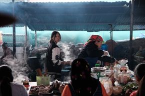 Khu chợ sẽ được chia ra thành nhiều khu khác nhau: có khu trong nhà được tổ chức chia thành từng quầy bán bánh, thực phẩm khô. Cũng có khu ngoài trời nơi mà người dân chỉ việc đem hàng ra bày và bán thôi. Đôi lúc, mình cũng bắt gặp nhiều người chỉ đổi hàng hoá chứ chứ cũng không phải bỏ tiền ra mua gì.