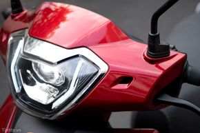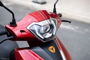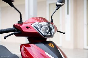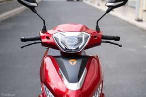 Phiên bản mà mình mượn được có màu đỏ bóng, kết hợp với các chi tiết màu đen. Từ phía trước, Yadea Voltguard nổi bật với hệ thống chiếu sáng LED với dải đèn định vị, cùng với bên trong là bi cầu LED. Trang bị này vừa giúp cho xe nhìn hiện đại hơn, vừa mang lại hiệu quả chiếu sáng tốt. Thực tế khi mình sử dụng xe trong đêm, đi qua các đoạn đường không có đèn thì thấy đèn cốt của xe cho cường độ sáng tốt, tầm chiếu ổn và đều. Khi mở đèn pha hoặc passing, đèn chiếu khá xa và đảm bảo được tầm quan sát để mình có thể di chuyển an toàn.