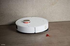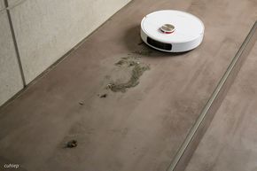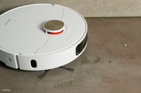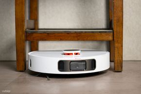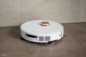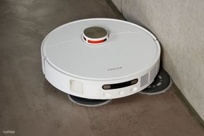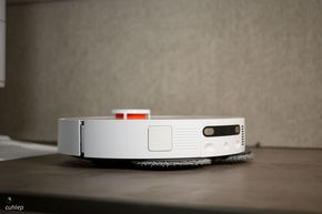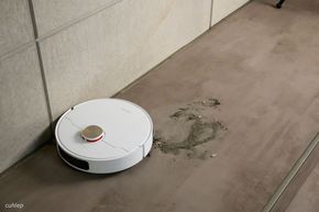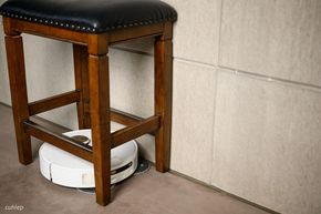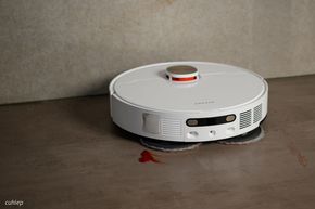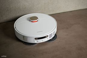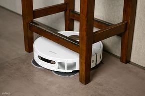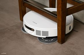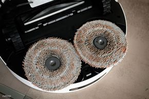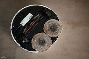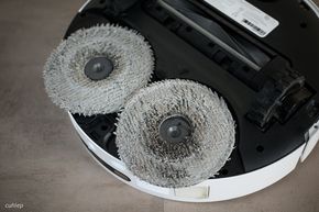 Giẻ lau bên phải đang được đưa xa ra để lau tới sát mép tường. Điều mà các robot hút bụi lau nhà khác không thể làm được.