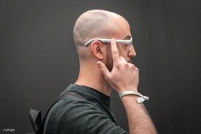 Hai chiếc mành hình Micro-LED xuyên kính được trang bị để hiển thị nội dung.
