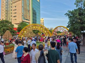 Trước Tết tầm hơn nửa tháng thì con đường Nguyễn Huệ là bắt đầu rục rịch những côn đoạn đầu tiên để xây dựng, lắp ráp các chi tiết trang trí và quan trọng là cho hoa vào. Theo tìm hiểu của mình thì toàn bộ chiều dài của đường hoa năm nay cỡ 700 mét. Chiều mùng 5, không khí ở đây vẫn cực kỳ nhộn nhịp, gia đình nào cũng đến đây để mong có những bức ảnh lưu lại kỷ niệm nhân dịp năm mới. 2 bên đường, các khu vực bán đồ ăn nhanh xuất hiện để phục vụ nhu cầu.