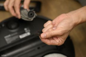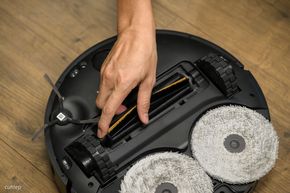 Tóc sau khi được cắt thì đi vào trong khay rác trên robot luôn, không cuốn vào đầu chổi nữa.