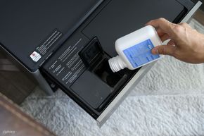 Châm hoá chất lau nhà, giặt giẻ vào trong trạm. Sau khi thêm xong thì robot sẽ tự động phân bổ vào bình nước trên robot hoặc để giặt giẻ.